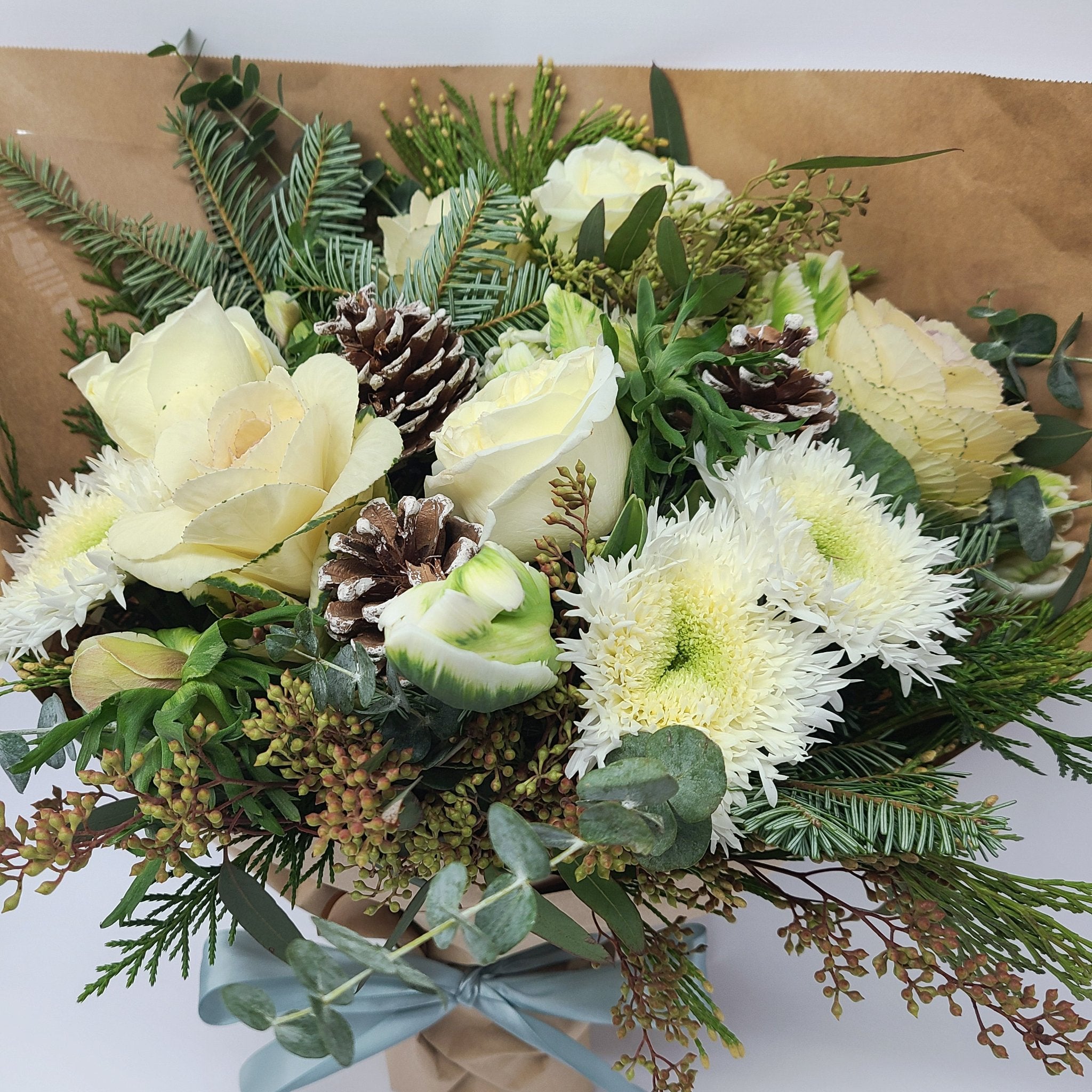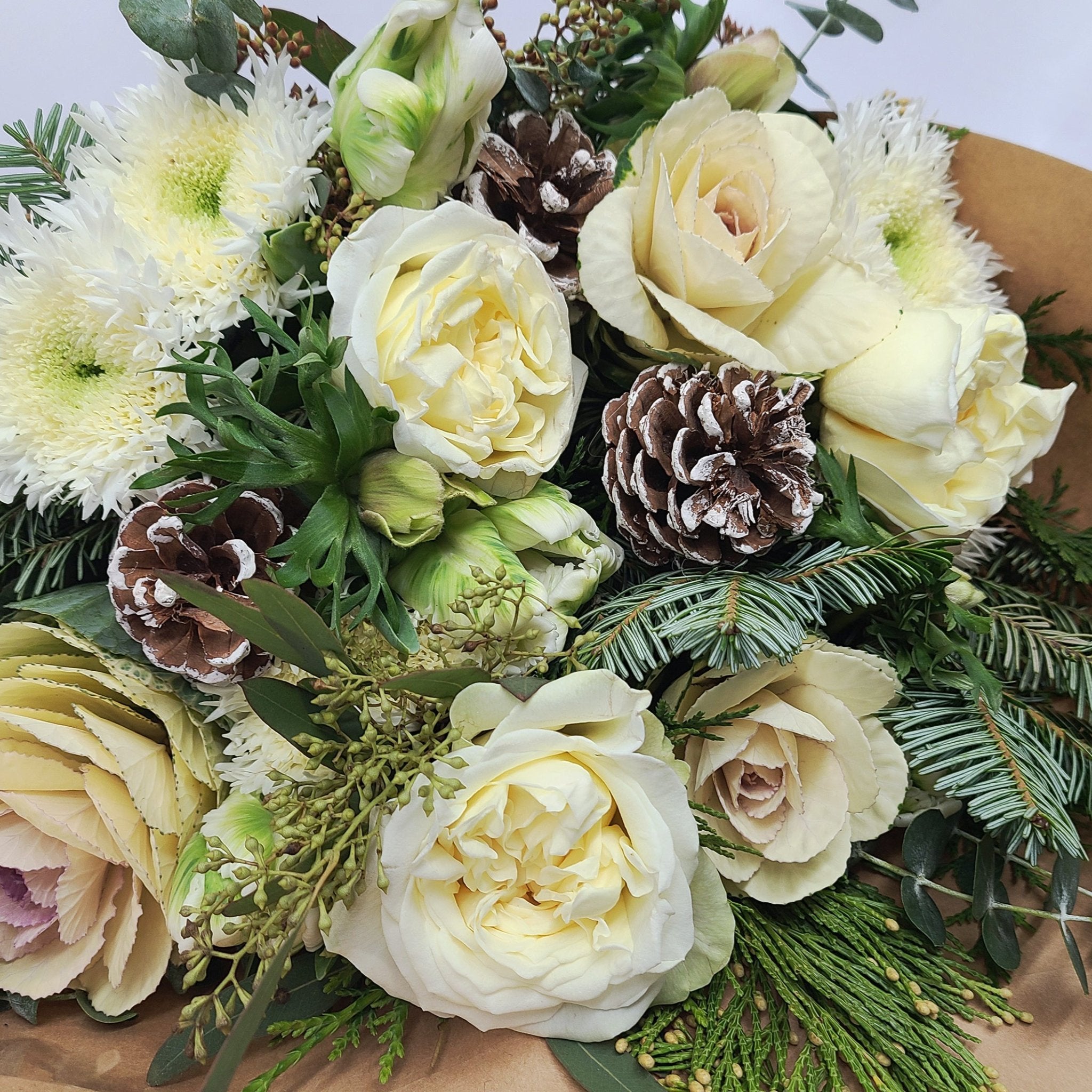 A winter-themed bouquet featuring seasonal greens and lush floral blooms. Perfect for the holiday season!