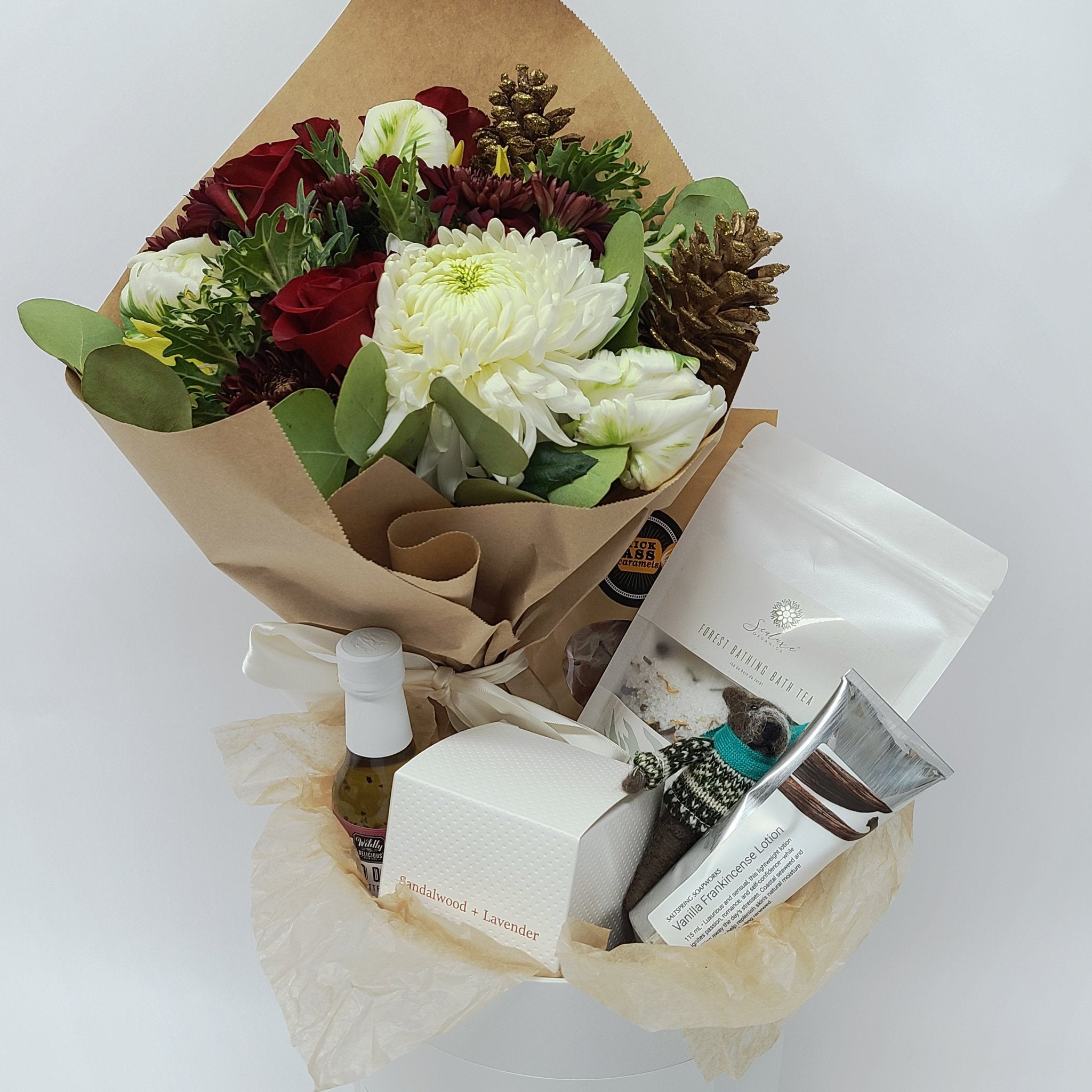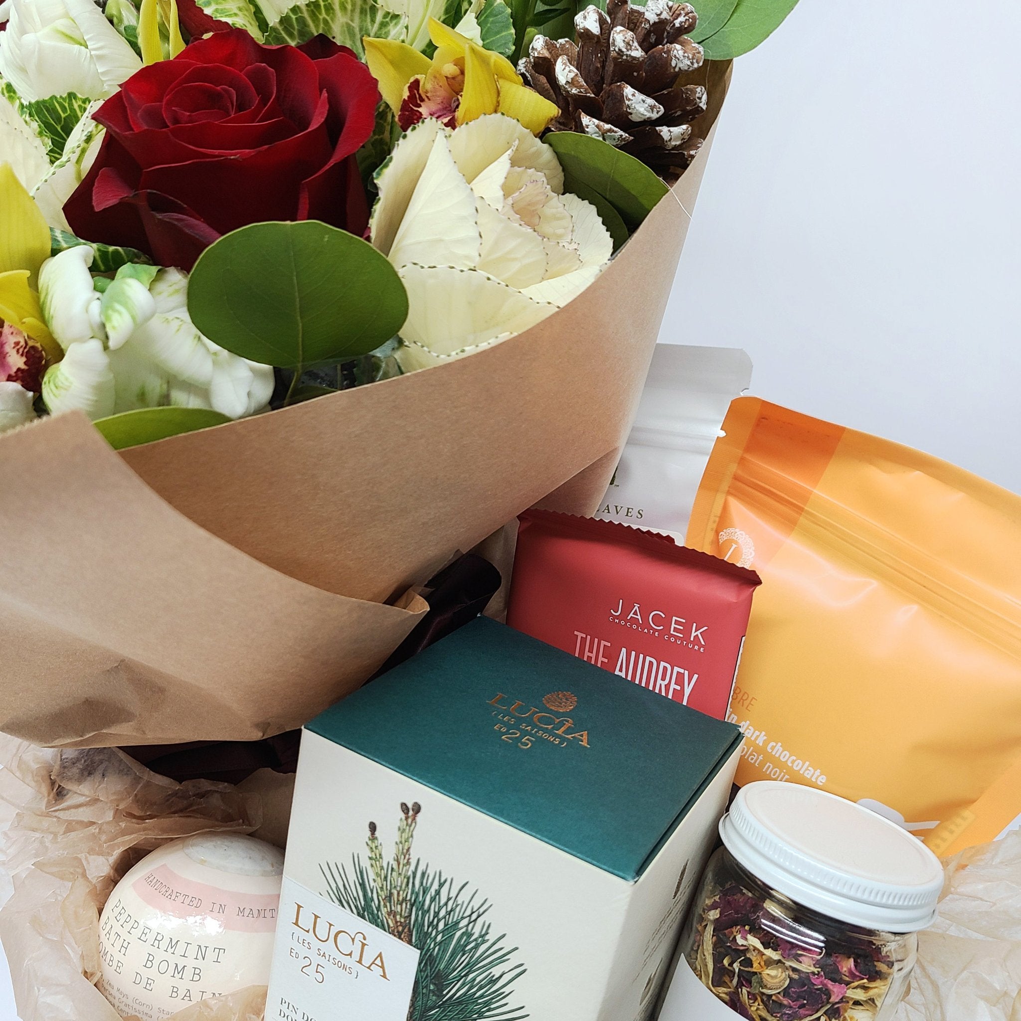 A holiday gift box of florals and gifts. Each box will vary. Gifts may include bath & body products, tea, chocolate, candy, candles, cookies, holiday tree ornaments, or other seasonal products.