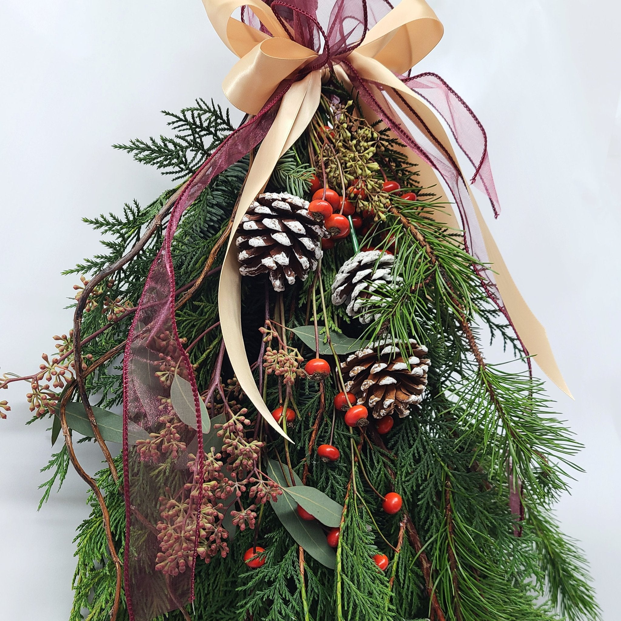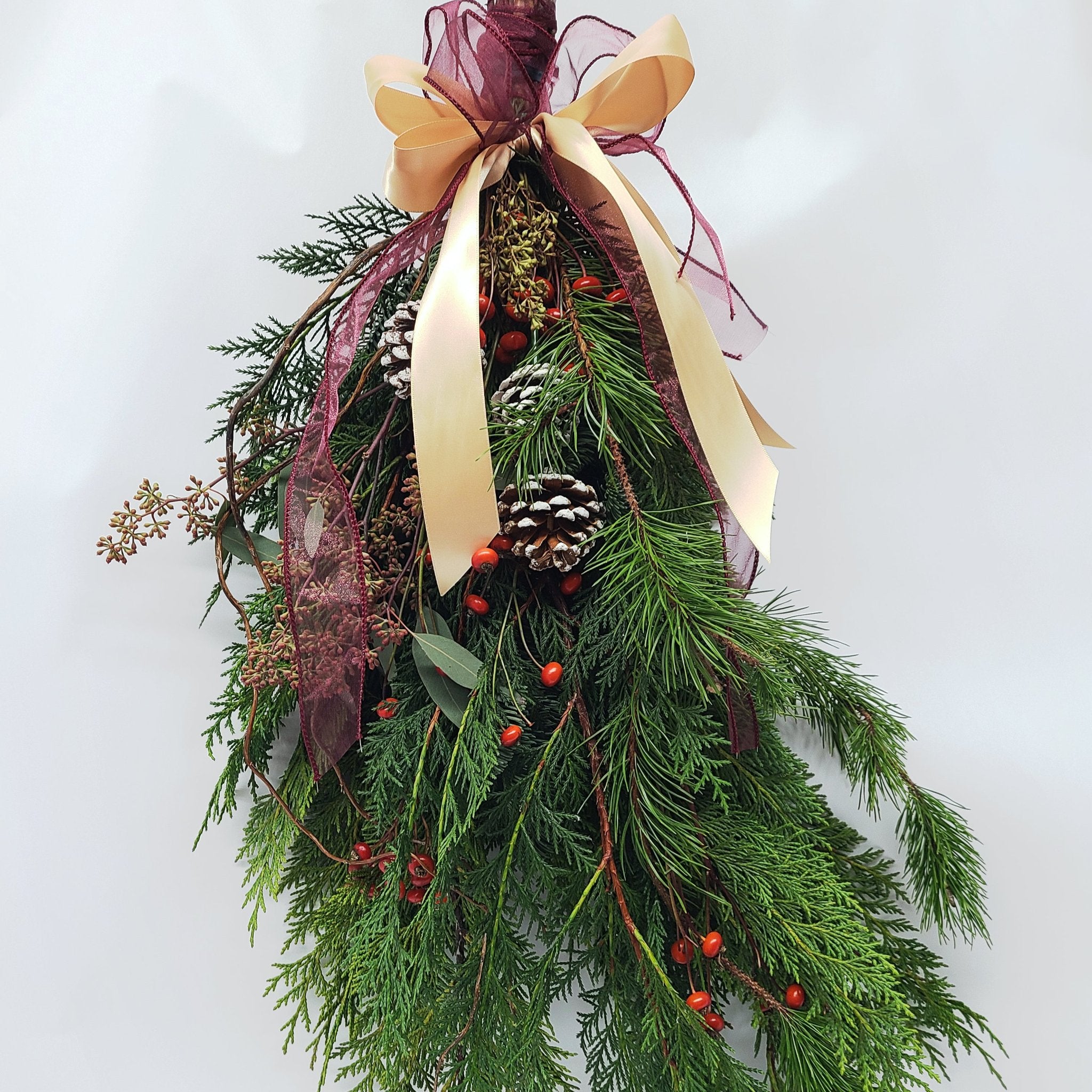 Seasonal winter swags! Perfect for a festive door, window, or wall embellishment. Our handmade traditional swags are made with locally-sourced aromatic winter greens, pine cones, berries, and more! Each is a hand-made original.